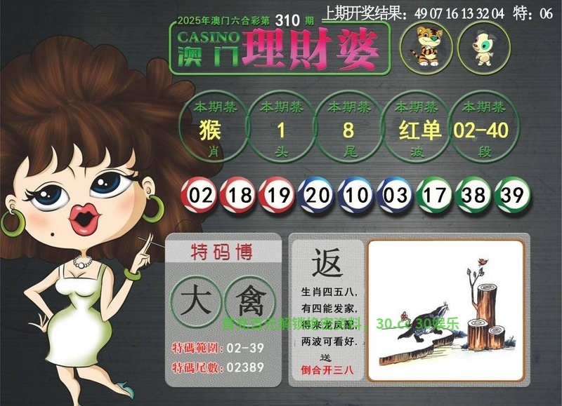 | 310期 | 猪狗鸡马 | 猴蛇虎兔 | 开:虎16准 |